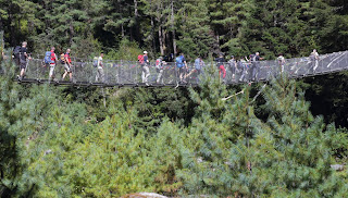 Having spent our first night in the mountains at Phakding (2610m) we set off to climb up to Namche Bazzar (3340m) the Sherpa capital of the Khumbu Region. The path stays close to the Dudh Koshi (Imja Kola) River for most of the way passing through pretty villages, crossing and recrossing the river several times on suspension bridges until it finally rises steeply through the forest up to Namche.